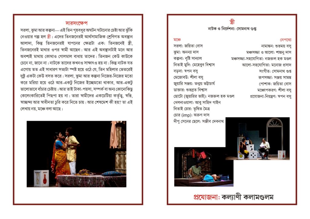 কল‍্যাণী কলামন্ডলম প্রযোজিত মাণিক বন্দ‍্যোপাধ‍্যায় রচিত তিনটি ছোট গল্প“দোকানীর বউ”, “জুয়াড়ীর বউ”, “ চোরের বউ” থেকে অনুপ্রাণিত নাটক “ স্ত্রী”র মধ্যে দিয়ে নাট‍্যকার-নির্দেশক সোমনাথ গুপ্ত সেই প্রশ্নটিই দর্শকদের সামনে তুলে ধরেছেন।