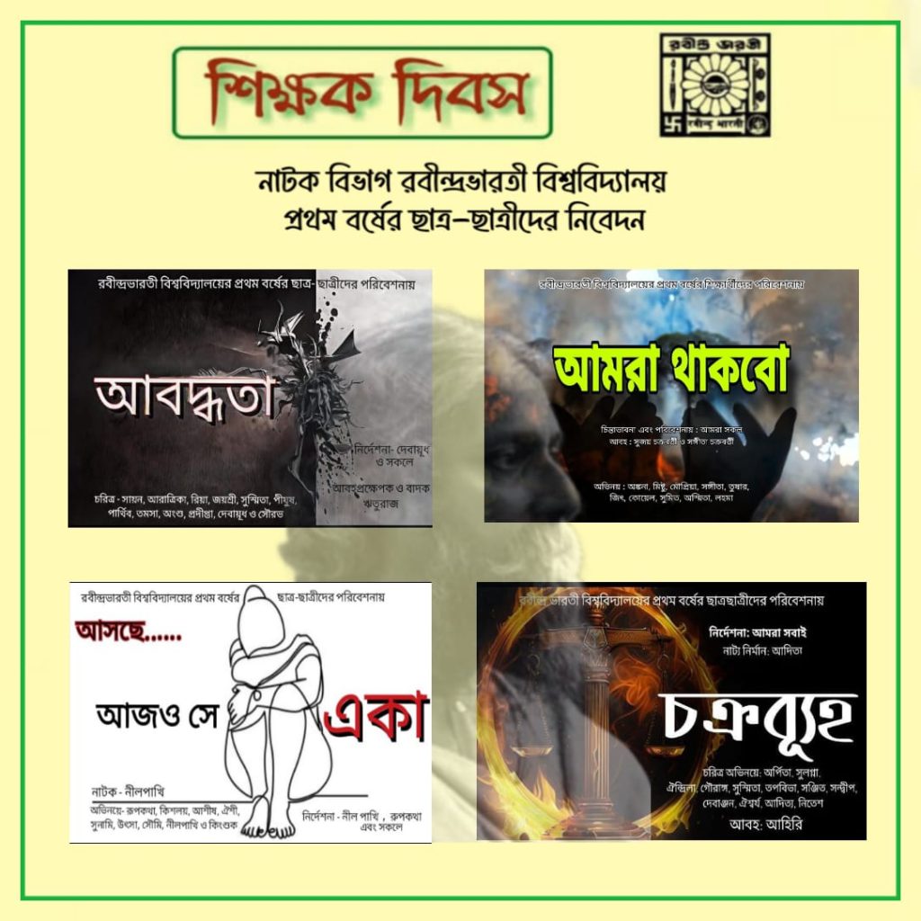 গত ৫ সেপ্টেম্বর শিক্ষক-দিবস উপলক্ষ্যে রবীন্দ্রভারতী বিশ্ববিদ্যালয়ের নাটক বিভাগ আয়োজিত শিক্ষক-শিক্ষিকা-শিক্ষাকর্মীদের সন্মাননা জ্ঞাপন অনুষ্ঠিত হলো বিশ্ববিদ্যালয়ের নটী বিনোদিনী মঞ্চে। সেই সঙ্গে ছিল স্নাতক প্রথম বর্ষের ছাত্রছাত্রীদের চারটি ছোট নাটকের উপস্থাপনা, যেগুলোর চিন্তা-ভাবনা-মঞ্চায়ণ সমস্ত কিছুই সম্পূর্ণ তাদের নিজস্ব প্রচেষ্টার প্রতিফলন। বতর্মান শিক্ষাব‍্যবস্থায় যে আবদ্ধতা ও ইঁদূর-দৌড়, তা তুলে ধরার
